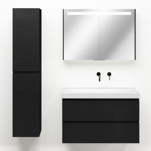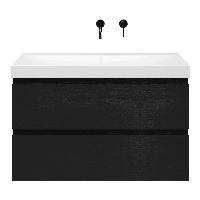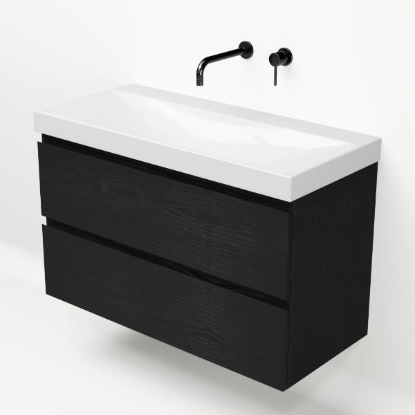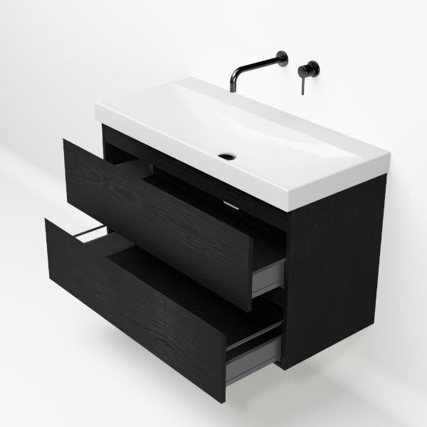 Greeploos badkamermeubel in de kleur zwart mat eiken is 100 cm breed.  De wastafel is vervaardig in keramiek en heeft de kleur wit glans. Dit badkamermeubel met deze wastafel is leverbaar in 100 cm.