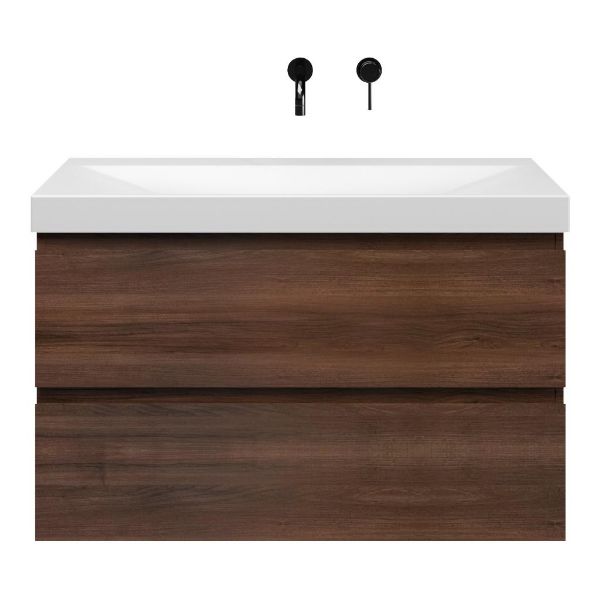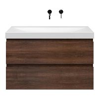 Greeploos badkamermeubel in de kleur walnoot is 100 cm breed.  De wastafel is vervaardig in keramiek en heeft de kleur wit mat. Dit badkamermeubel met deze wastafel is leverbaar in 100 cm.