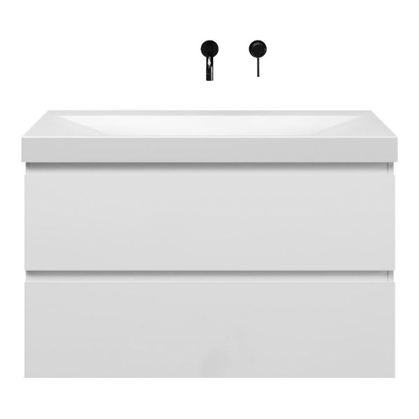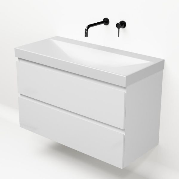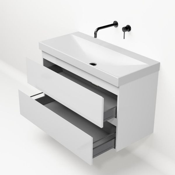 Greeploos badkamermeubel in de kleur wit hoogglans is 100 cm breed.  De wastafel is vervaardig in keramiek en heeft de kleur wit mat. Dit badkamermeubel met deze wastafel is leverbaar in 100 cm.