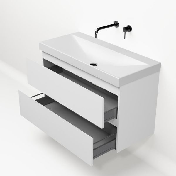 Greeploos badkamermeubel in de kleur wit mat is 100 cm breed.  De wastafel is vervaardig in keramiek en heeft de kleur wit mat. Dit badkamermeubel met deze wastafel is leverbaar in 100 cm.