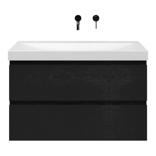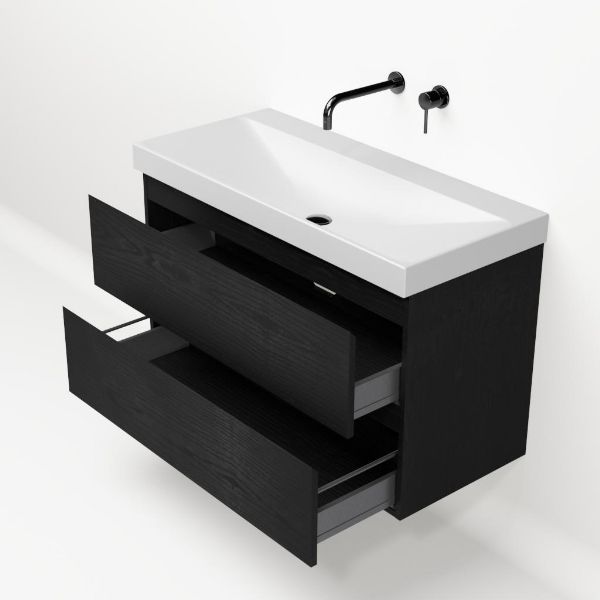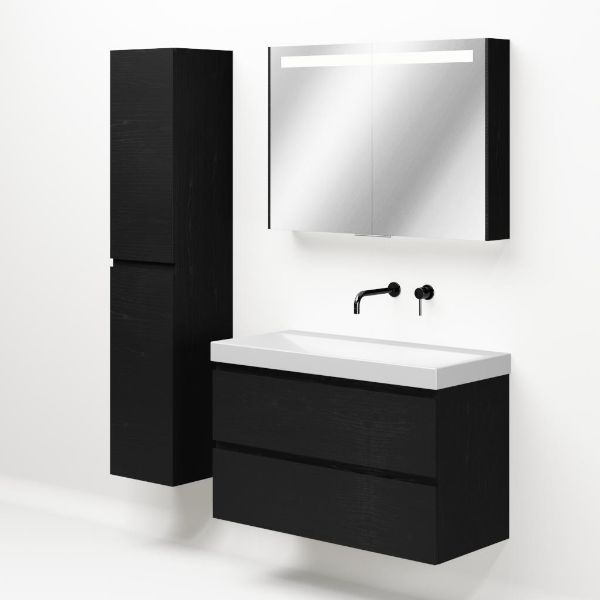Greeploos badkamermeubel in de kleur zwart mat eiken is 100 cm breed.  De wastafel is vervaardig in keramiek en heeft de kleur wit mat. Dit badkamermeubel met deze wastafel is leverbaar in 100 cm.