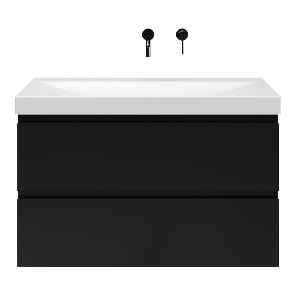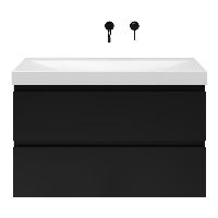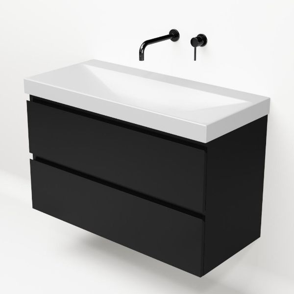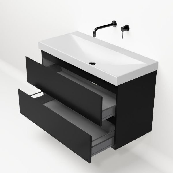Greeploos badkamermeubel in de kleur zwart mat is 100 cm breed.  De wastafel is vervaardig in keramiek en heeft de kleur wit mat. Dit badkamermeubel met deze wastafel is leverbaar in 100 cm.