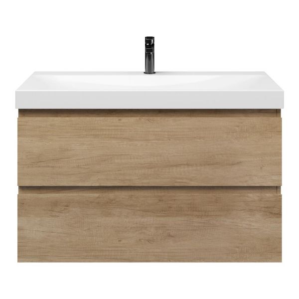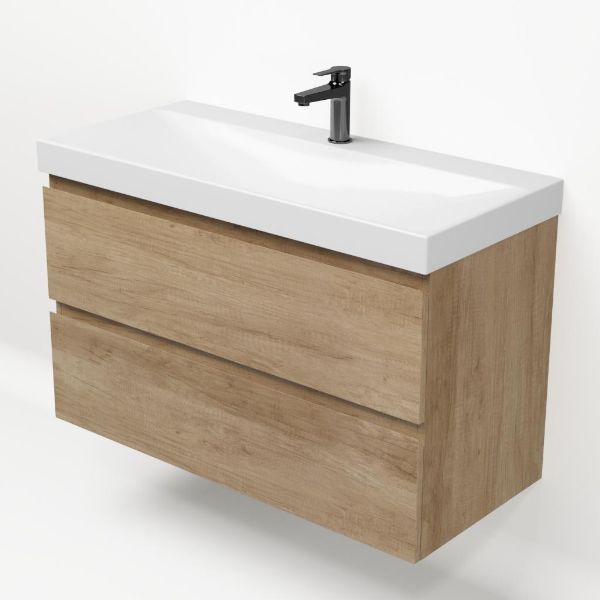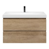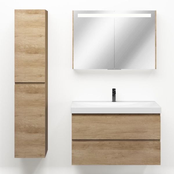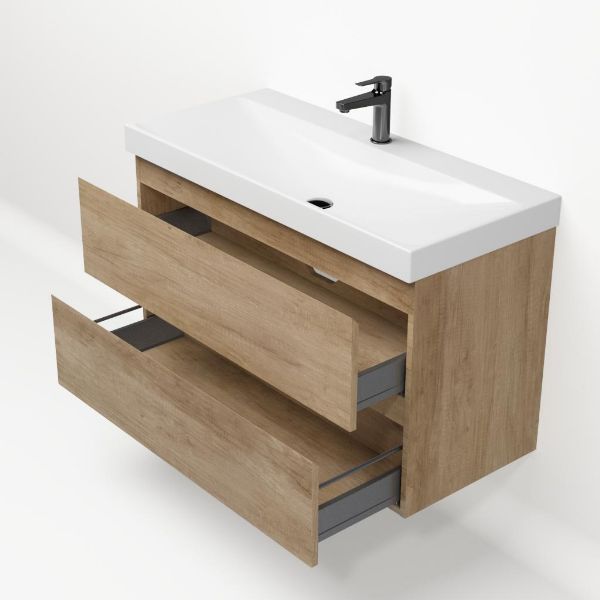 Greeploos badkamermeubel in de kleur olm is 100 cm breed.  De wastafel is vervaardig in keramiek en heeft de kleur wit glans. Dit badkamermeubel met deze wastafel is leverbaar in 100 cm