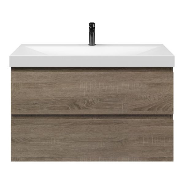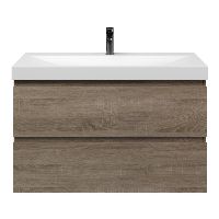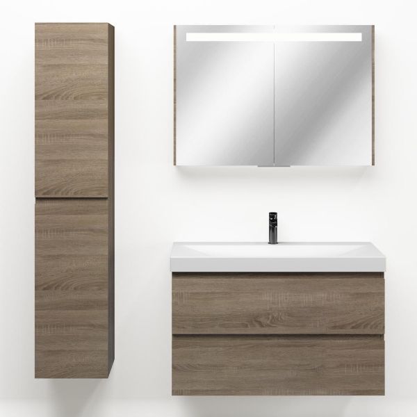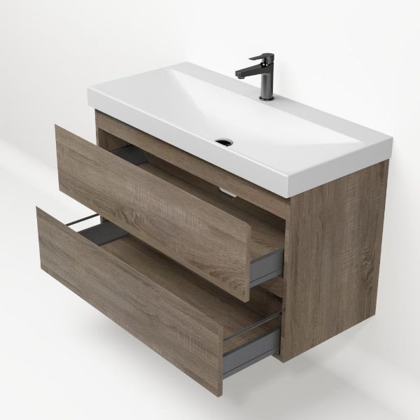 Greeploos badkamermeubel in de kleur eiken donker is 100 cm breed.  De wastafel is vervaardig in keramiek en heeft de kleur wit mat. Dit badkamermeubel met deze wastafel is leverbaar in 100 cm