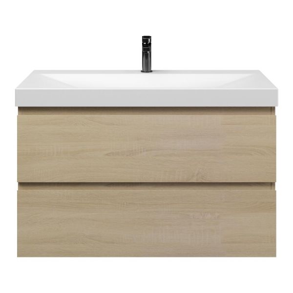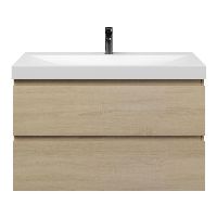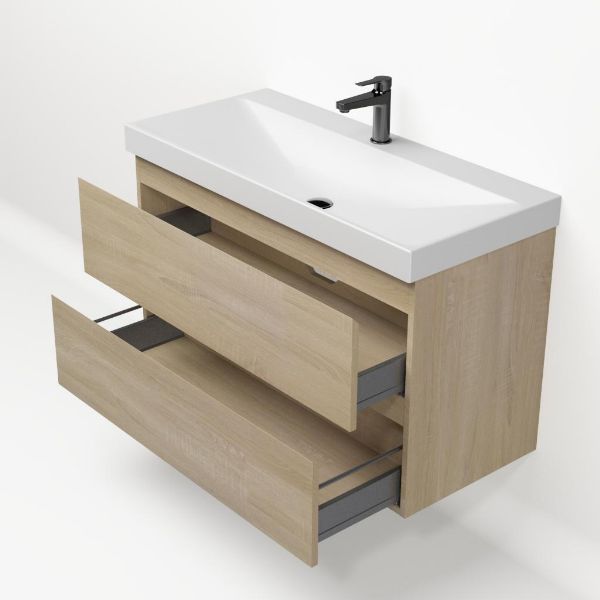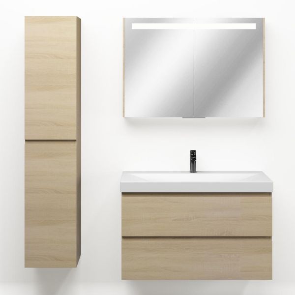 Greeploos badkamermeubel in de kleur eiken licht is 100 cm breed.  De wastafel is vervaardig in keramiek en heeft de kleur wit mat. Dit badkamermeubel met deze wastafel is leverbaar in 100 cm