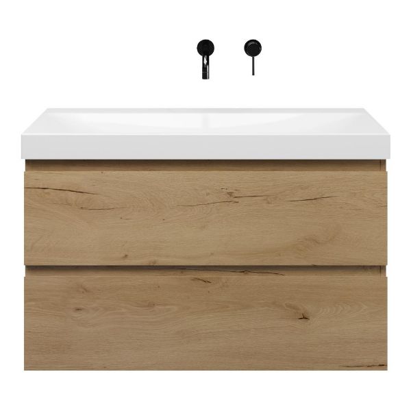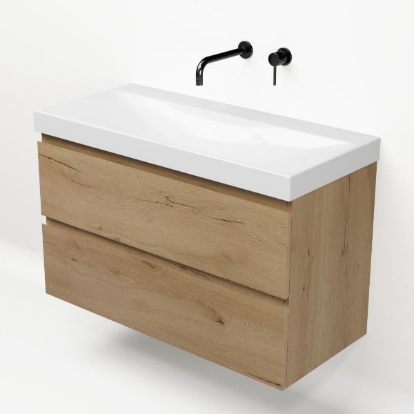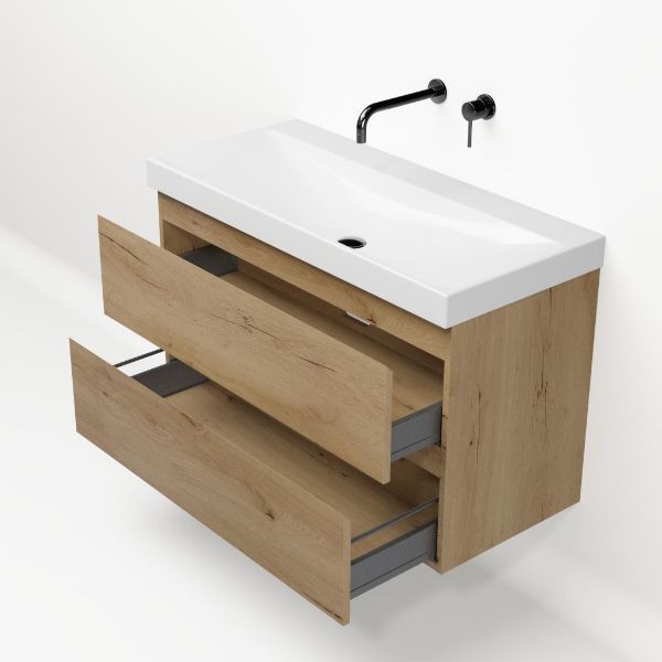 Greeploos badkamermeubel in de kleur eiken natuur is 100 cm breed.  De wastafel is vervaardig in keramiek en heeft de kleur wit glans. Dit badkamermeubel met deze wastafel is leverbaar in 100 cm