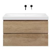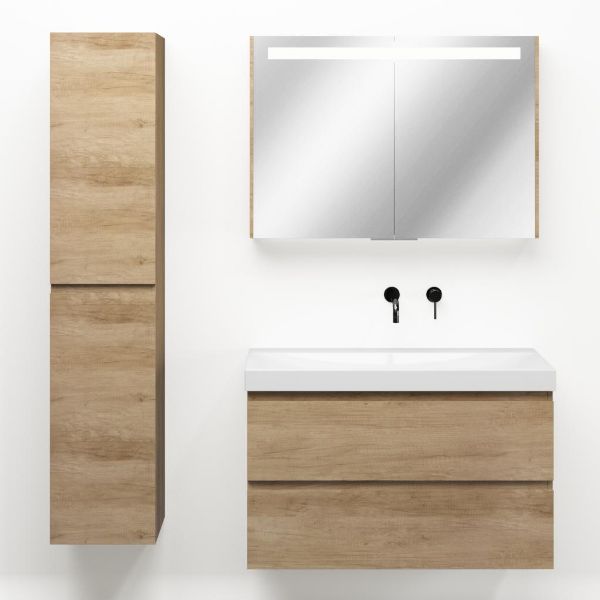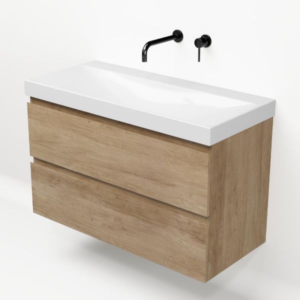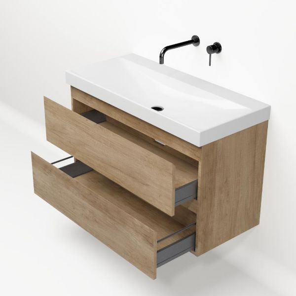 Greeploos badkamermeubel in de kleur olm is 100 cm breed.  De wastafel is vervaardig in keramiek en heeft de kleur wit glans. Dit badkamermeubel met deze wastafel is leverbaar in 100 cm