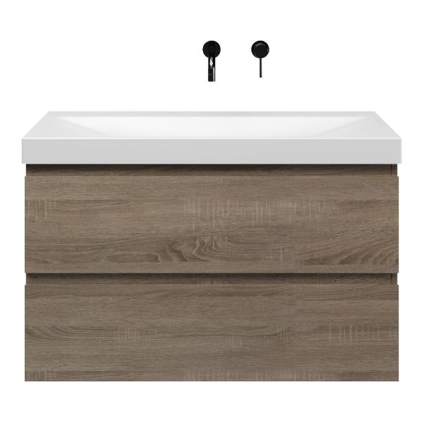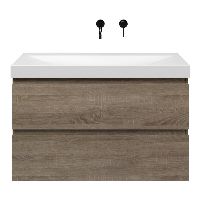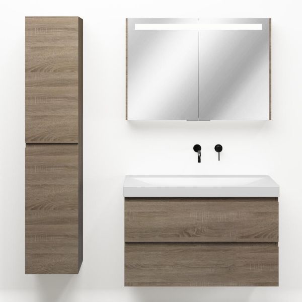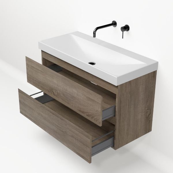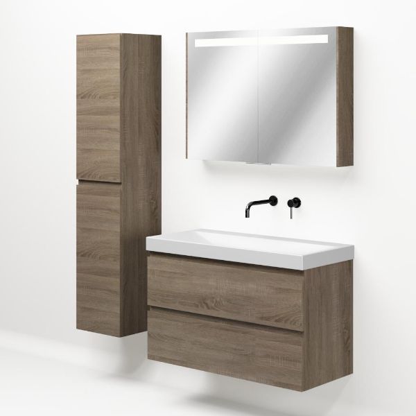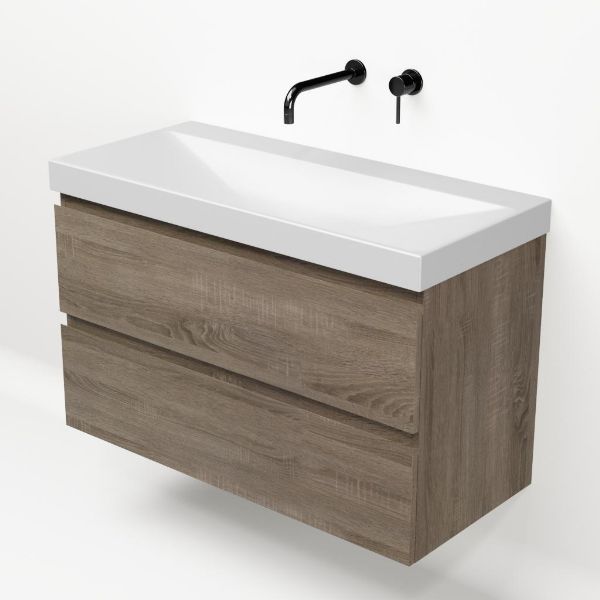 Greeploos badkamermeubel in de kleur eiken donker is 100 cm breed.  De wastafel is vervaardig in keramiek en heeft de kleur wit mat. Dit badkamermeubel met deze wastafel is leverbaar in 100 cm