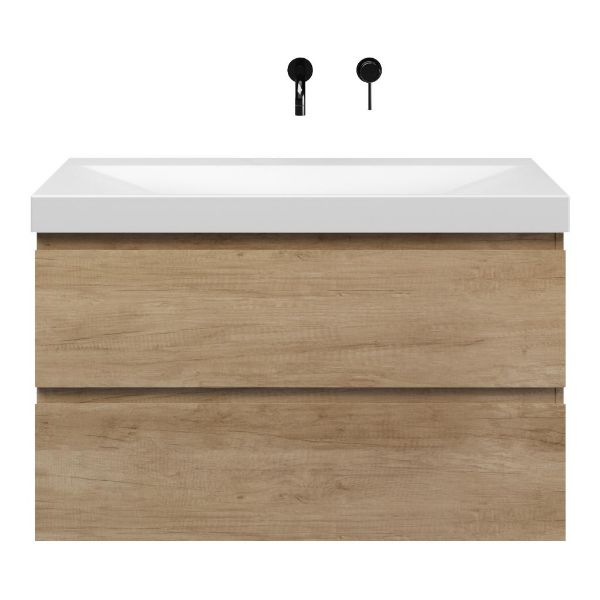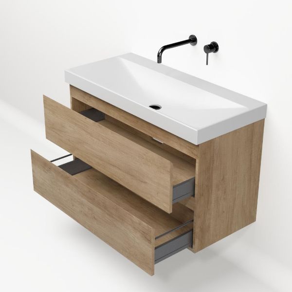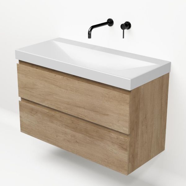 Greeploos badkamermeubel in de kleur olm is 100 cm breed.  De wastafel is vervaardig in keramiek en heeft de kleur wit mat. Dit badkamermeubel met deze wastafel is leverbaar in 100 cm