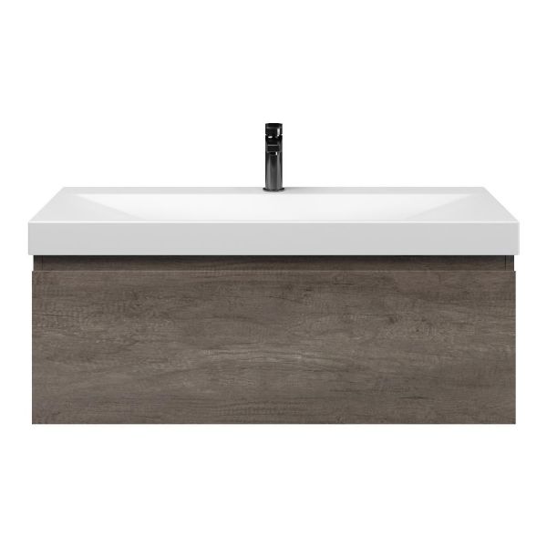 Greeploos badkamermeubel in de kleur olm donker grijs is 100 cm breed. De wastafel is vervaardig in keramiek en heeft de kleur wit mat keramiek. Dit badkamermeubel met deze wastafel is leverbaar in 100 en 120 cm