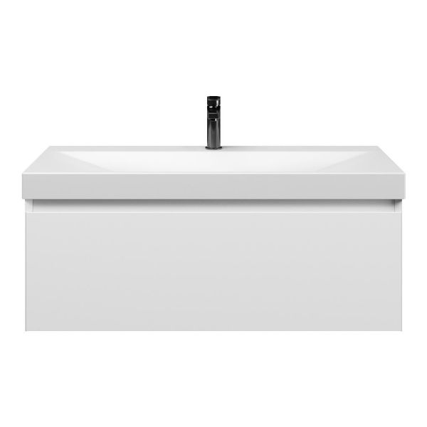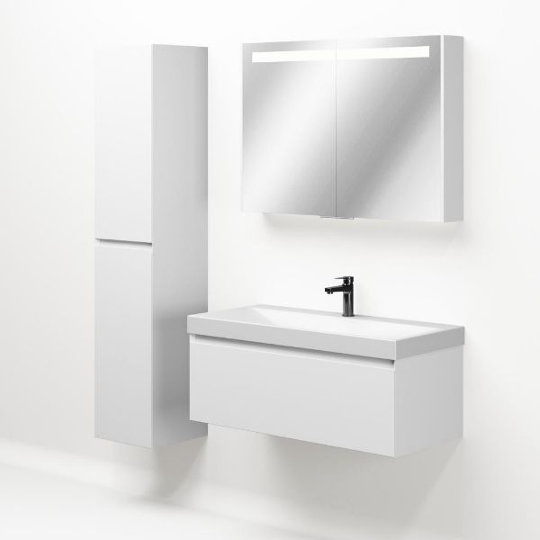 Greeploos badkamermeubel in de kleur wit mat is 100 cm breed. De wastafel is vervaardig in keramiek en heeft de kleur wit mat keramiek. Dit badkamermeubel met deze wastafel is leverbaar in 100 en 120 cm