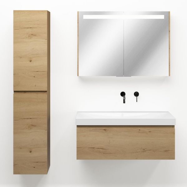 Greeploos badkamermeubel in de kleur eiken natuur is 100 cm breed. De wastafel is vervaardig in keramiek en heeft de kleur wit glans. Dit badkamermeubel met deze wastafel is leverbaar in 100 en 120 cm