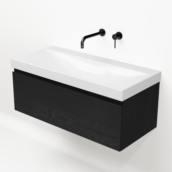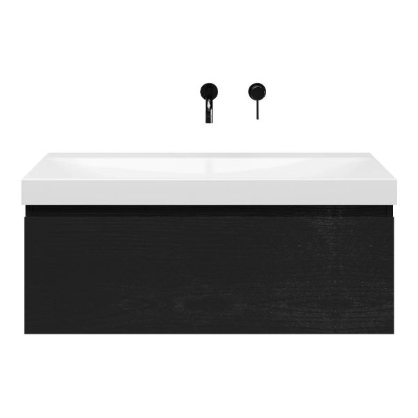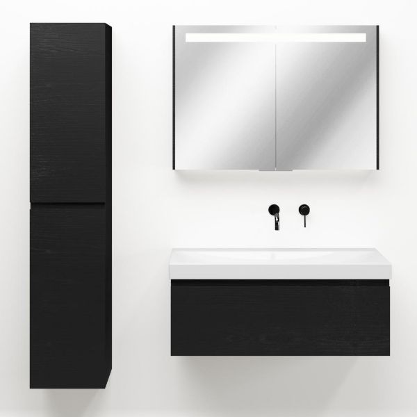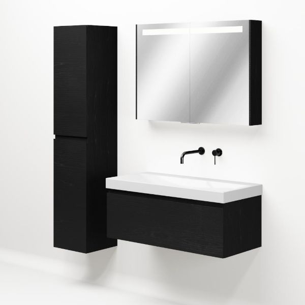 Greeploos badkamermeubel in de kleur zwart mat eiken is 100 cm breed. De wastafel is vervaardig in keramiek en heeft de kleur wit glans. Dit badkamermeubel met deze wastafel is leverbaar in 100 en 120 cm