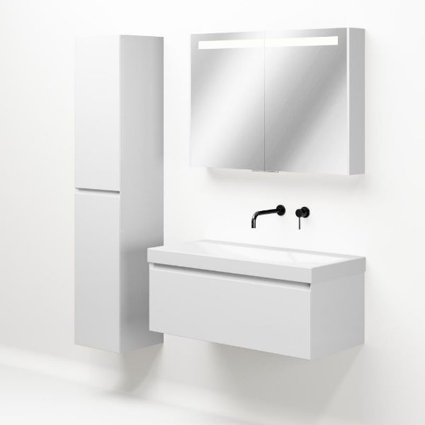 Greeploos badkamermeubel in de kleur wit hoogglans is 100 cm breed. De wastafel is vervaardig in keramiek en heeft de kleur wit glans. Dit badkamermeubel met deze wastafel is leverbaar in 100 en 120 cm