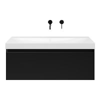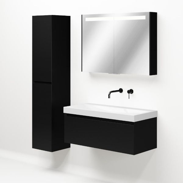 Greeploos badkamermeubel in de kleur zwart mat is 100 cm breed. De wastafel is vervaardig in keramiek en heeft de kleur wit glans. Dit badkamermeubel met deze wastafel is leverbaar in 100 en 120 cm