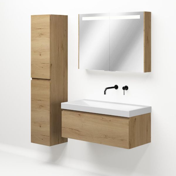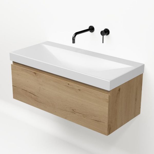 | | Bellanti Solo/Jenthe badmeubel 100x46 1 softclose lade eiken natuur greeploos keramische wastafel wit mat zonder kraangaten |