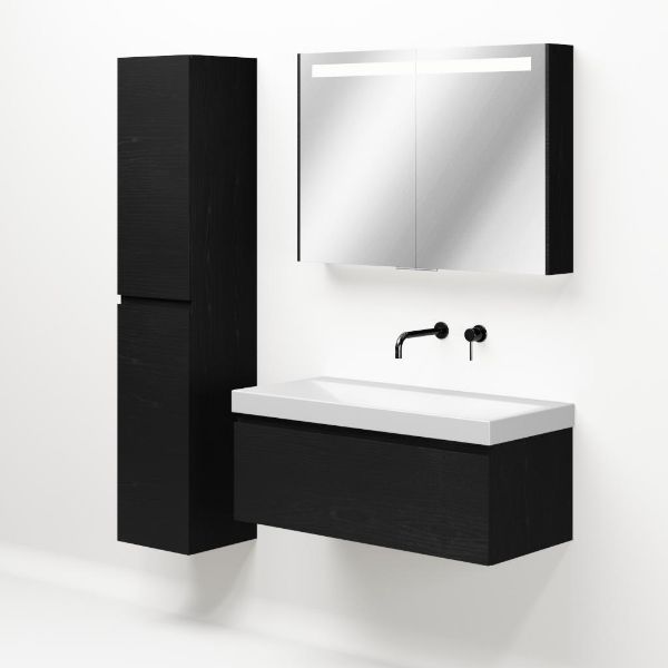 Greeploos badkamermeubel in de kleur zwart mat eiken is 100 cm breed. De wastafel is vervaardig in keramiek en heeft de kleur wit mat keramiek. Dit badkamermeubel met deze wastafel is leverbaar in 100 en 120 cm