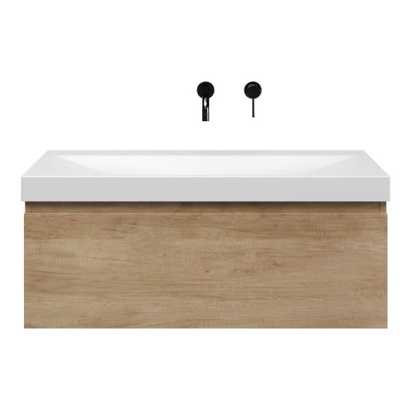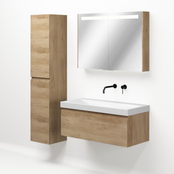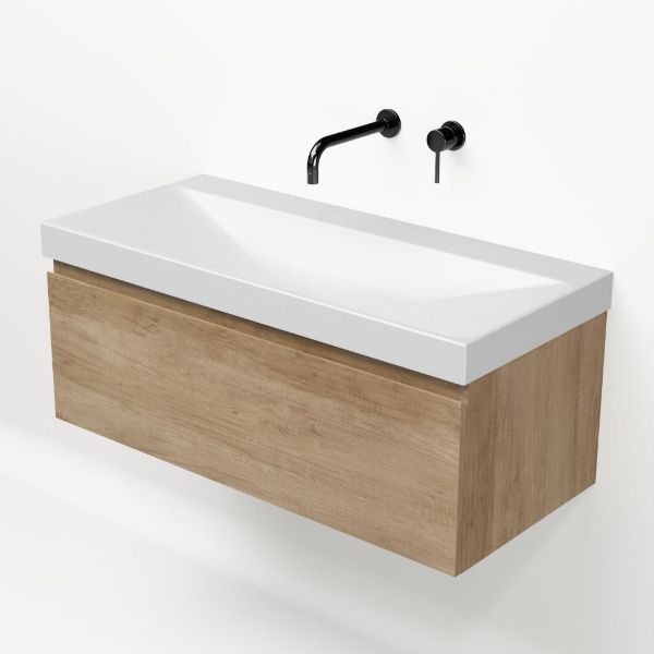 Greeploos badkamermeubel in de kleur olm is 100 cm breed. De wastafel is vervaardig in keramiek en heeft de kleur wit mat keramiek. Dit badkamermeubel met deze wastafel is leverbaar in 100 en 120 cm