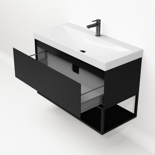 Bellanti Solo/Tela/Jenthe badmeubel 100x46 1 softclose lade zwart mat greeploos keramische wastafel wit glans met 1 kraangat met mat zwart metalen frame