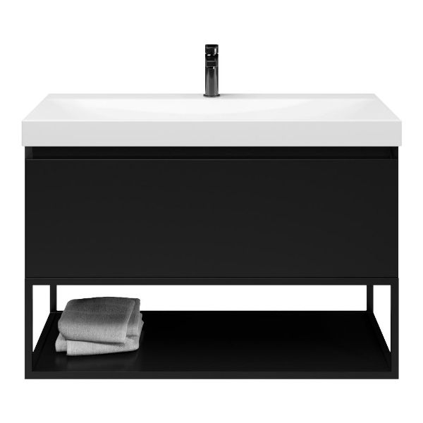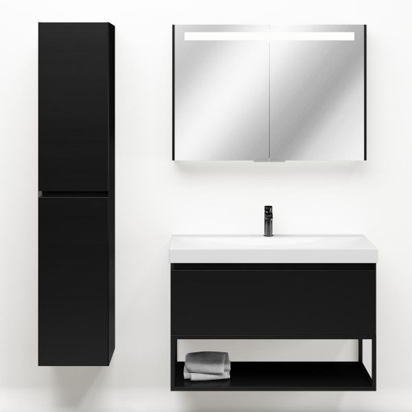 Greeploos badkamermeubel in de kleur zwart mat is 100 cm breed.  De wastafel is vervaardig in keramiek en heeft de kleur wit glans. Dit badkamermeubel met deze wastafel is leverbaar tussen de 60 cm t/m 140 cm