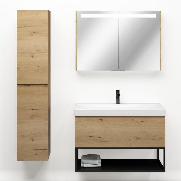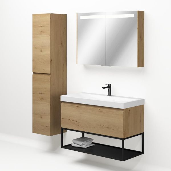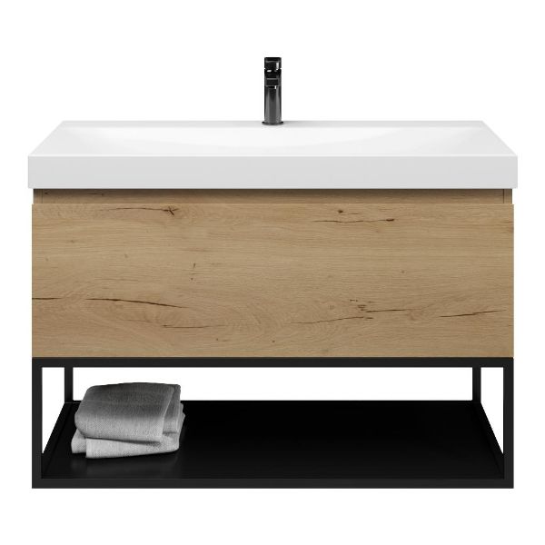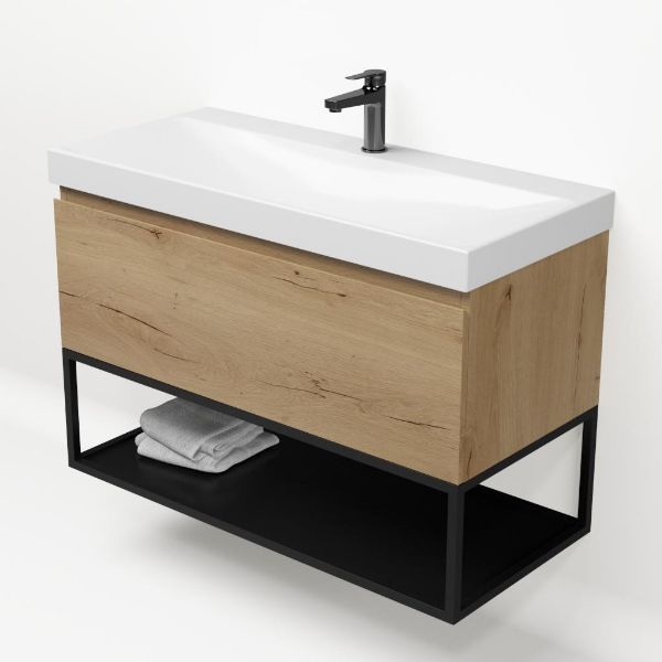 Bellanti Solo/Tela/Jenthe badmeubel 100x46 1 softclose lade eiken natuur greeploos keramische wastafel wit glans met 1 kraangat met mat zwart metalen frame