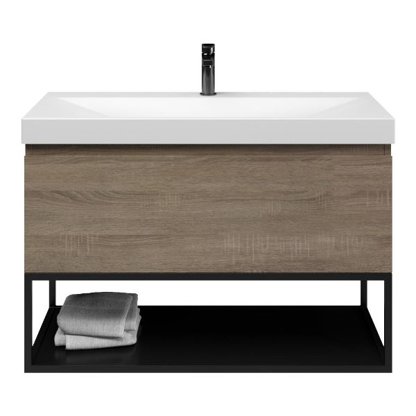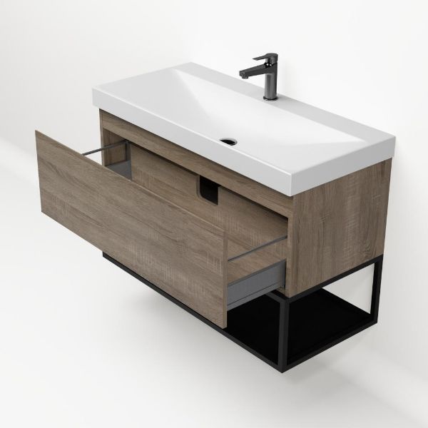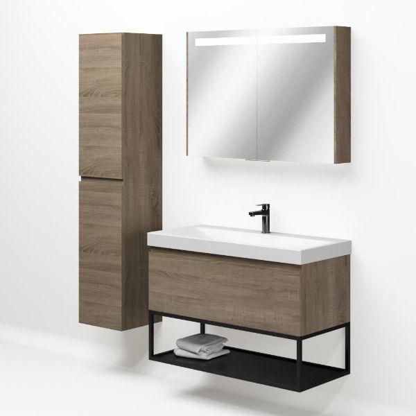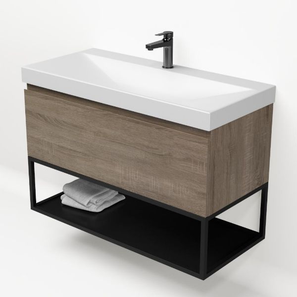 Bellanti Solo/Tela/Jenthe badmeubel 100x46 1 softclose lade eiken donker greeploos keramische wastafel wit mat met 1 kraangat met mat zwart metalen frame