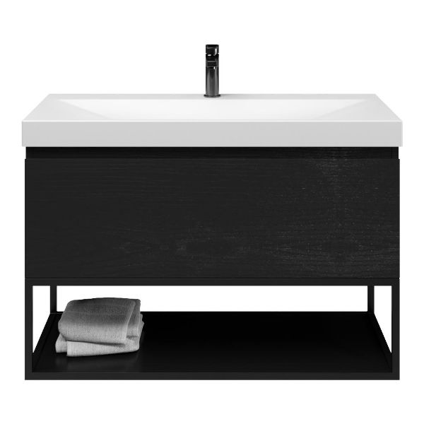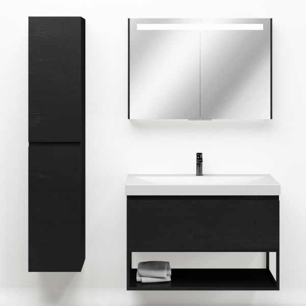 Greeploos badkamermeubel in de kleur zwart mat eiken is 100 cm breed.  De wastafel is vervaardig in keramiek en heeft de kleur wit mat. Dit badkamermeubel met deze wastafel is leverbaar tussen de 60 cm t/m 140 cm
