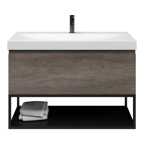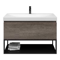 Greeploos badkamermeubel in de kleur olm donker grijs is 100 cm breed.  De wastafel is vervaardig in keramiek en heeft de kleur wit mat. Dit badkamermeubel met deze wastafel is leverbaar tussen de 60 cm t/m 140 cm