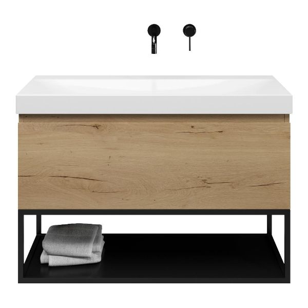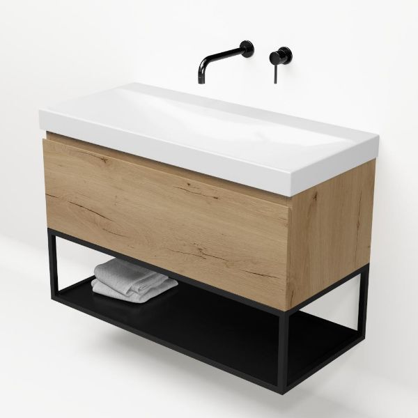 Bellanti Solo/Tela/Jenthe badmeubel 100x46 1 softclose lade eiken natuur greeploos keramische wastafel wit glans zonder kraangaten met mat zwart metalen frame