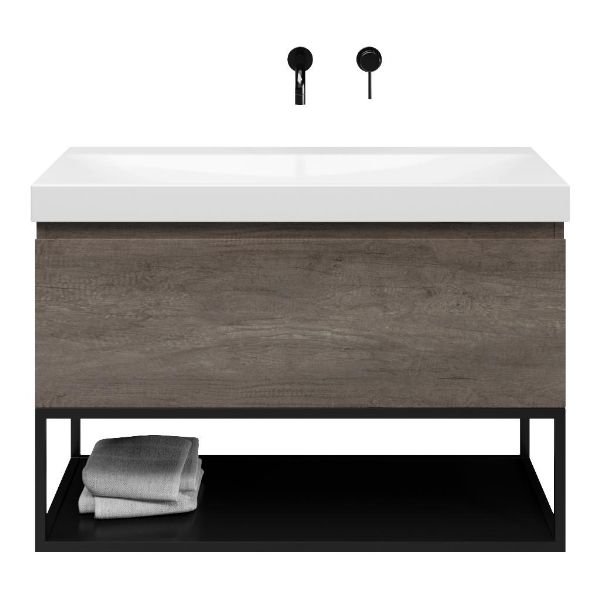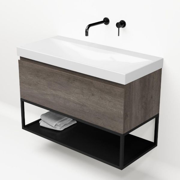 Bellanti Solo/Tela/Jenthe badmeubel 100x46 1 softclose lade olm donker grijs greeploos keramische wastafel wit glans zonder kraangaten met mat zwart metalen frame