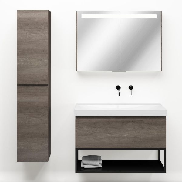 Greeploos badkamermeubel in de kleur olm donker grijs is 100 cm breed.  De wastafel is vervaardig in keramiek en heeft de kleur wit glans. Dit badkamermeubel met deze wastafel is leverbaar tussen de 60 cm t/m 140 cm