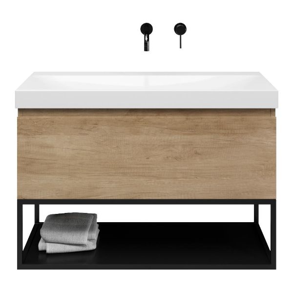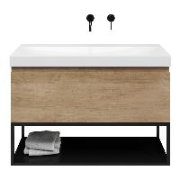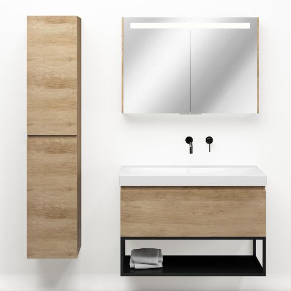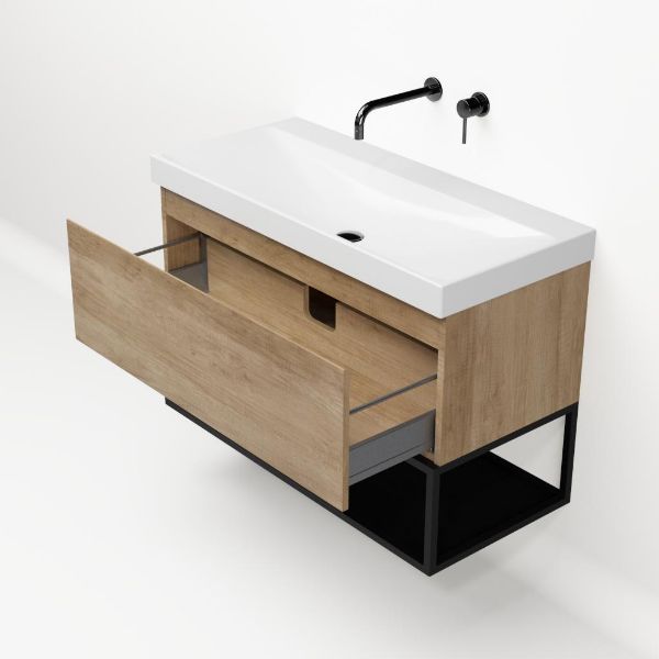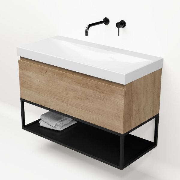 Bellanti Solo/Tela/Jenthe badmeubel 100x46 1 softclose lade olm greeploos keramische wastafel wit glans zonder kraangaten met mat zwart metalen frame