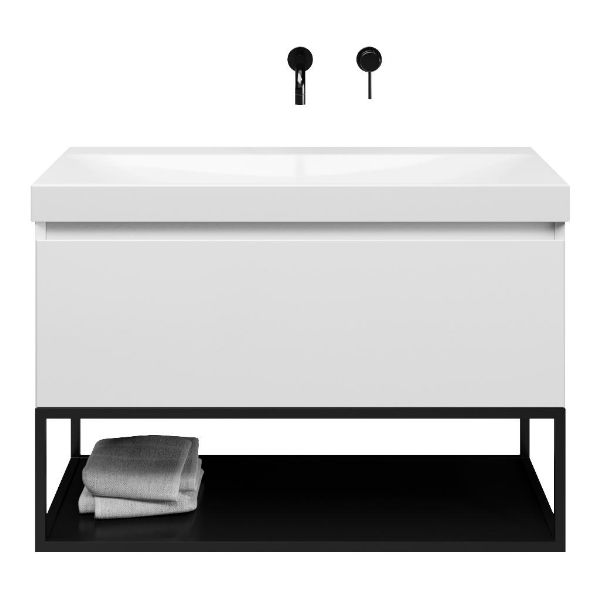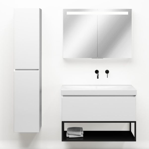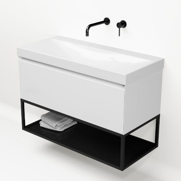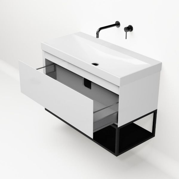 Bellanti Solo/Tela/Jenthe badmeubel 100x46 1 softclose lade wit hoogglans greeploos keramische wastafel wit glans zonder kraangaten met mat zwart metalen frame