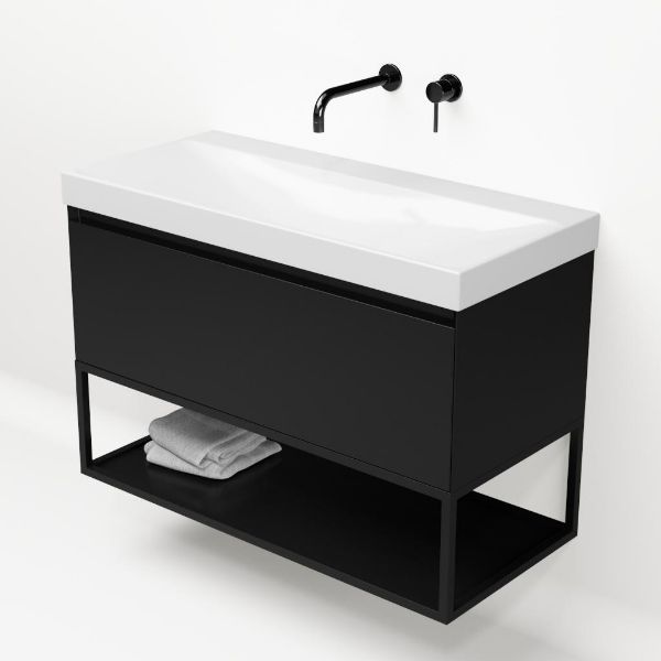 Bellanti Solo/Tela/Jenthe badmeubel 100x46 1 softclose lade zwart mat greeploos keramische wastafel wit glans zonder kraangaten met mat zwart metalen frame