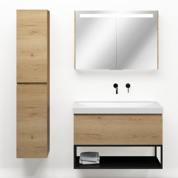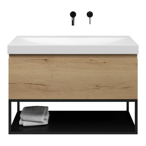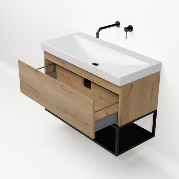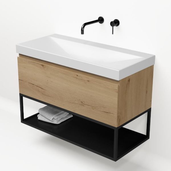 Bellanti Solo/Tela/Jenthe badmeubel 100x46 1 softclose lade eiken natuur greeploos keramische wastafel wit mat zonder kraangaten met mat zwart metalen frame