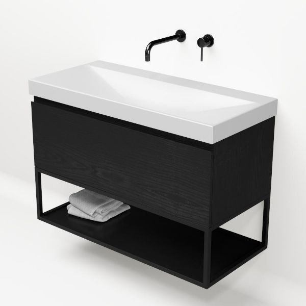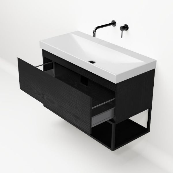 Bellanti Solo/Tela/Jenthe badmeubel 100x46 1 softclose lade mat zwart eiken greeploos keramische wastafel wit mat zonder kraangaten met mat zwart metalen frame