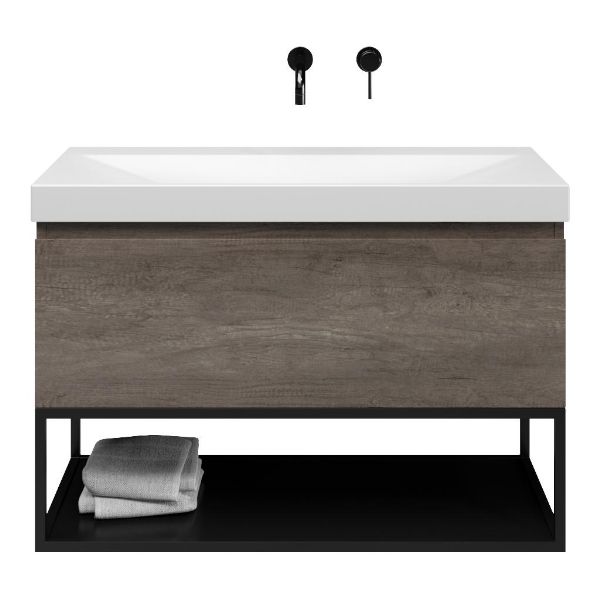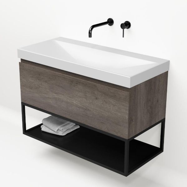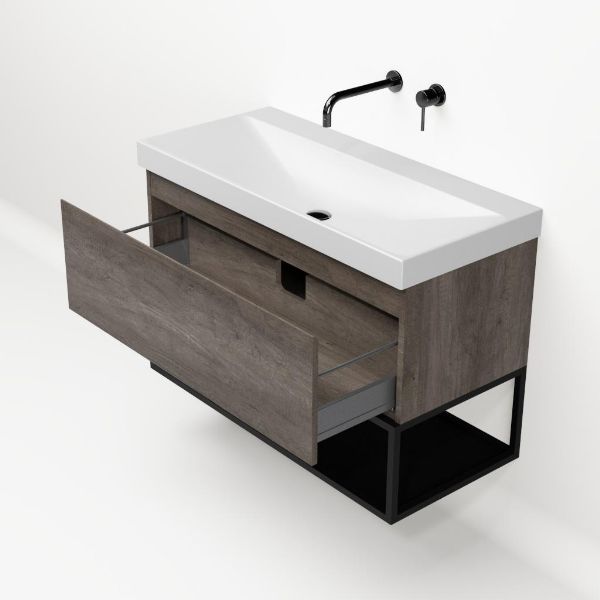 Bellanti Solo/Tela/Jenthe badmeubel 100x46 1 softclose lade olm donker grijs greeploos keramische wastafel wit mat zonder kraangaten met mat zwart metalen frame