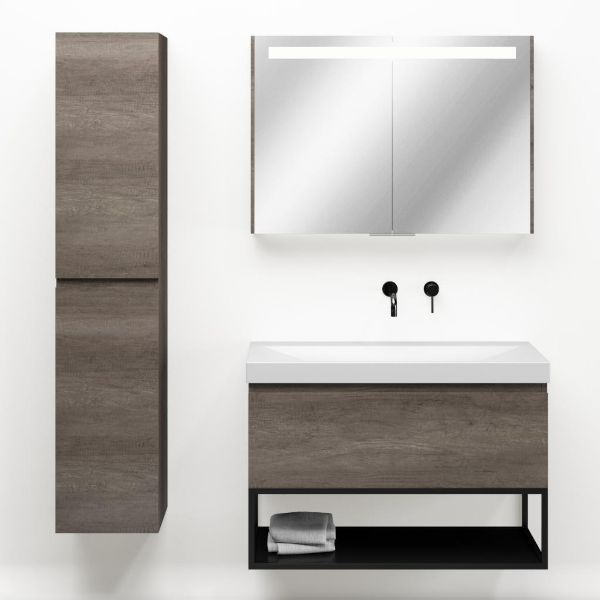 Greeploos badkamermeubel in de kleur olm donker grijs is 100 cm breed.  De wastafel is vervaardig in keramiek en heeft de kleur wit mat. Dit badkamermeubel met deze wastafel is leverbaar tussen de 60 cm t/m 140 cm