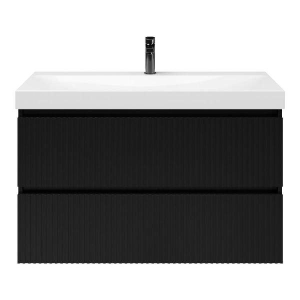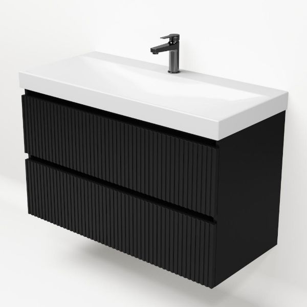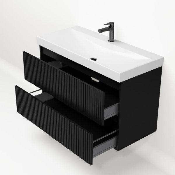 Greeploos badkamermeubel in de kleur zwart mat met met ribbel - latjes structuur is 100 cm breed. De wastafel is vervaardig in keramiek en heeft de kleur wit glans. Dit badkamermeubel met deze wastafel is leverbaar in de 100 en 120 cm