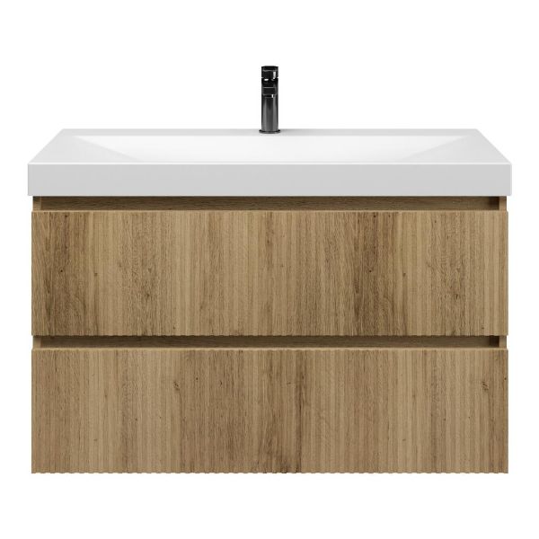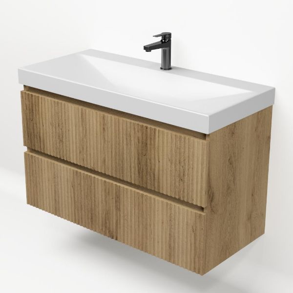 Greeploos badkamermeubel in de kleur eiken warm met met ribbel - latjes structuur is 100 cm breed. De wastafel is vervaardig in keramiek en heeft de kleur wit mat keramiek. Dit badkamermeubel met deze wastafel is leverbaar in de 100 en 120 cm