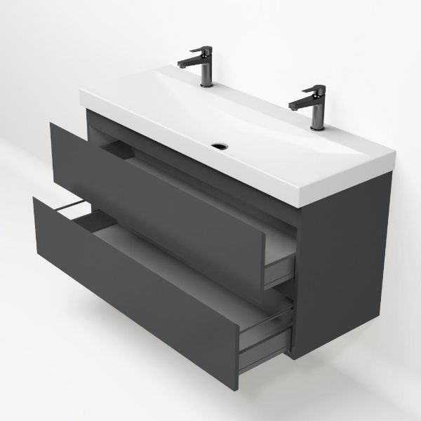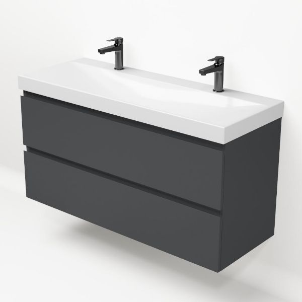 | | Bellanti Fiore/Jenthe badmeubel 120x46 2 softclose laden antraciet mat greeploos keramische wastafel wit glans met 2 kraangaten |