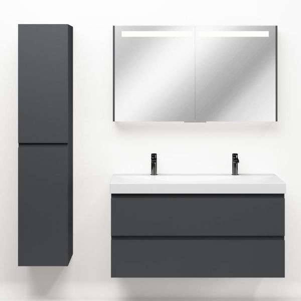 Greeploos badkamermeubel in de kleur antraciet mat is 120 cm breed. De wastafel is vervaardig in keramiek en heeft de kleur wit glans. Dit badkamermeubel met deze wastafel is leverbaar in 120 cm.