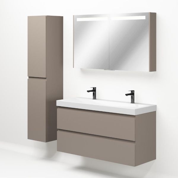 Greeploos badkamermeubel in de kleur taupe is 120 cm breed. De wastafel is vervaardig in keramiek en heeft de kleur wit glans. Dit badkamermeubel met deze wastafel is leverbaar in 120 cm.