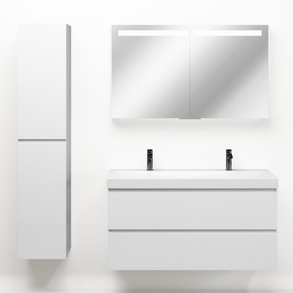 Greeploos badkamermeubel in de kleur wit hoogglans is 120 cm breed. De wastafel is vervaardig in keramiek en heeft de kleur wit glans. Dit badkamermeubel met deze wastafel is leverbaar in 120 cm.