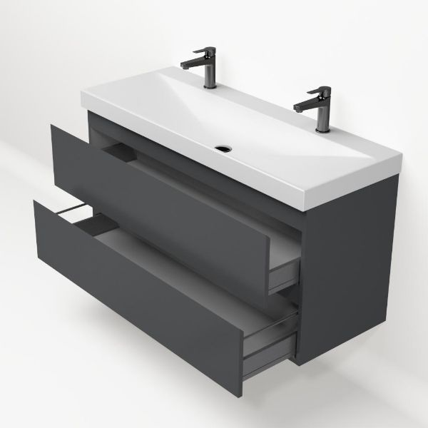 | | Bellanti Fiore/Jenthe badmeubel 120x46 2 softclose laden antraciet mat greeploos keramische wastafel wit mat met 2 kraangaten |