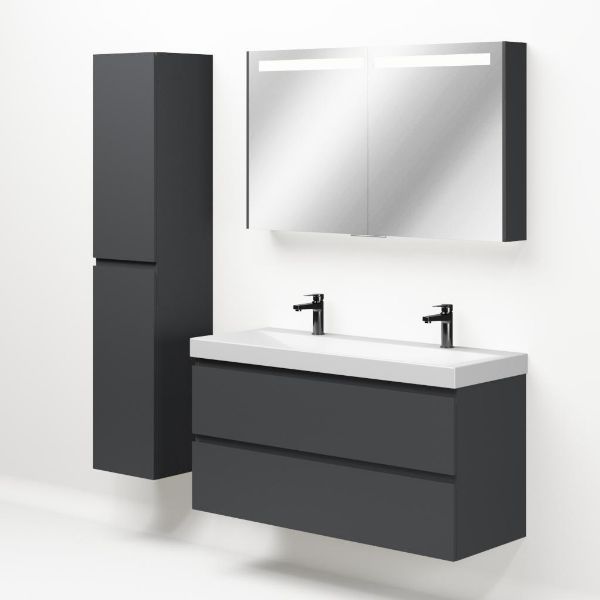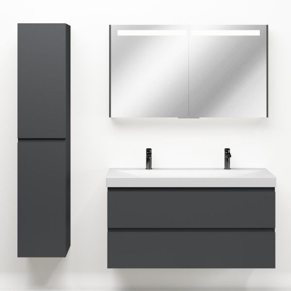 Greeploos badkamermeubel in de kleur antraciet mat is 120 cm breed. De wastafel is vervaardig in keramiek en heeft de kleur wit mat keramiek. Dit badkamermeubel met deze wastafel is leverbaar in 120 cm.