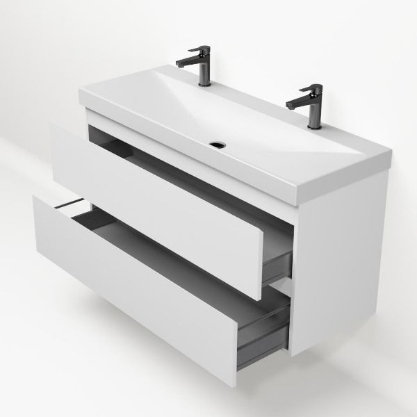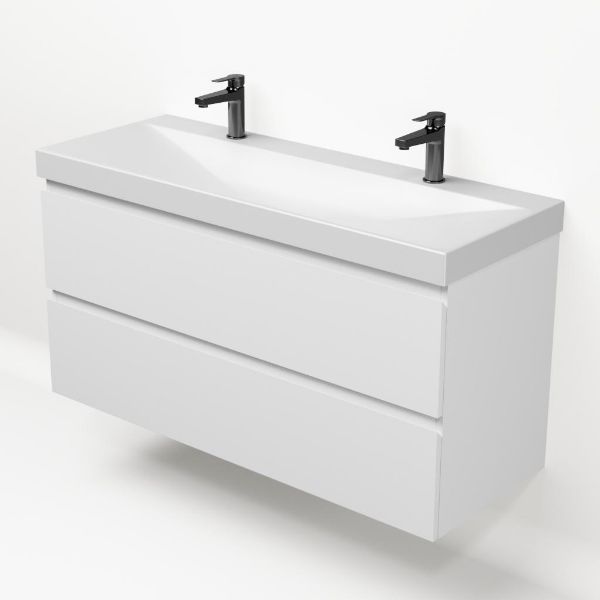 Greeploos badkamermeubel in de kleur wit mat is 120 cm breed. De wastafel is vervaardig in keramiek en heeft de kleur wit mat keramiek. Dit badkamermeubel met deze wastafel is leverbaar in 120 cm.