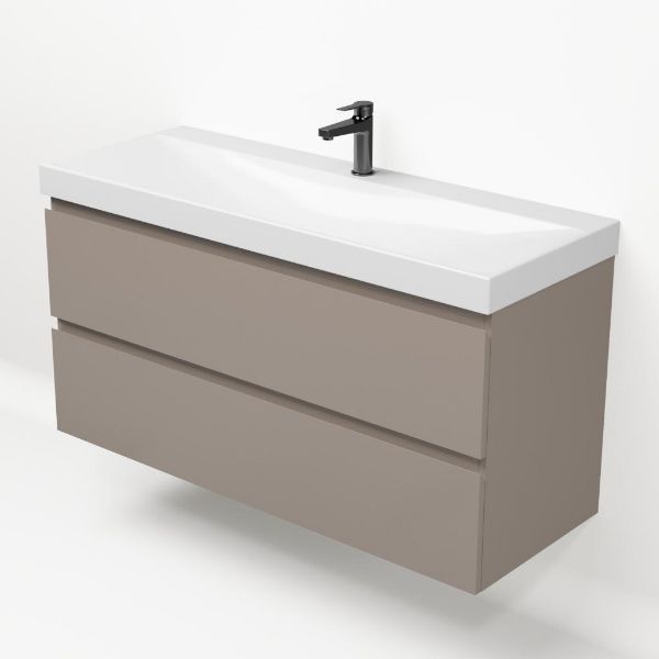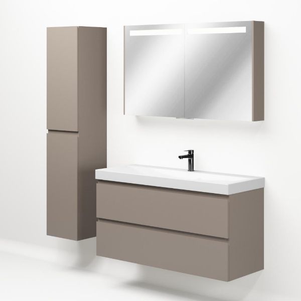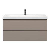 Greeploos badkamermeubel in de kleur taupe is 120 cm breed. De wastafel is vervaardig in keramiek en heeft de kleur wit glans. Dit badkamermeubel met deze wastafel is leverbaar in 120 cm.