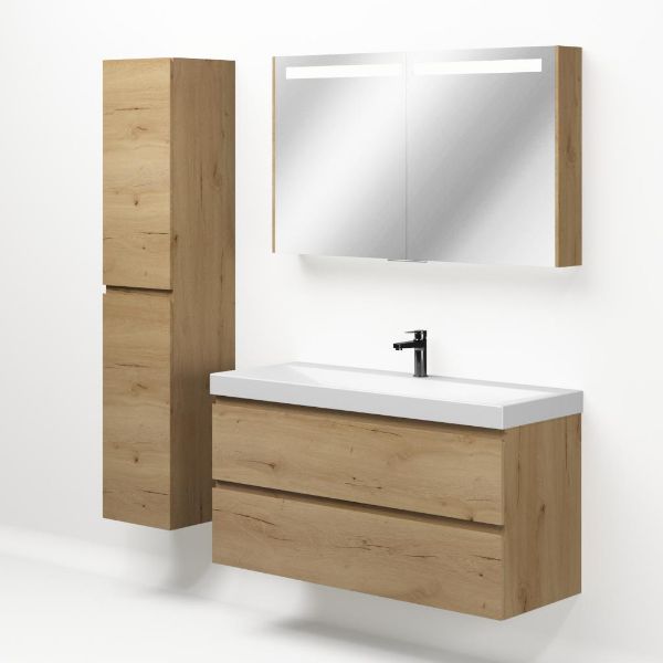 Greeploos badkamermeubel in de kleur eiken natuur is 120 cm breed. De wastafel is vervaardig in keramiek en heeft de kleur wit mat keramiek. Dit badkamermeubel met deze wastafel is leverbaar in 120 cm.