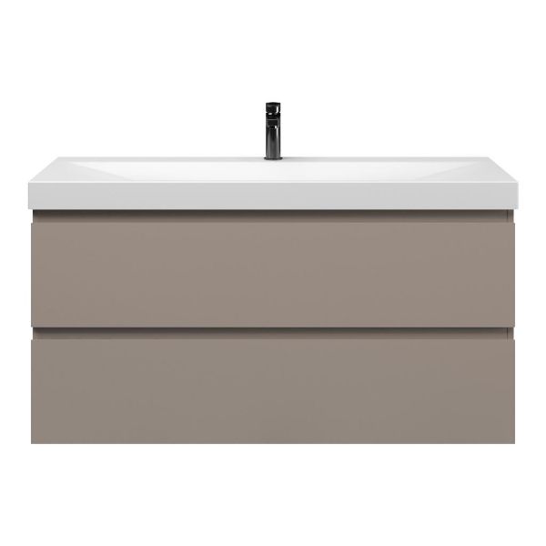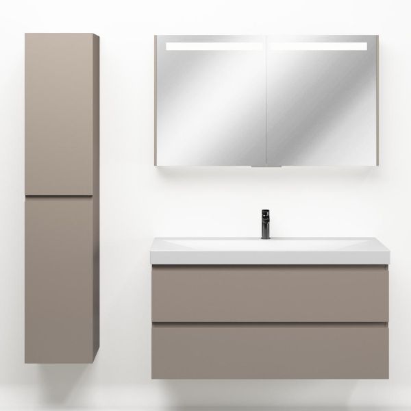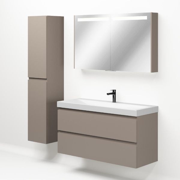 Greeploos badkamermeubel in de kleur taupe is 120 cm breed. De wastafel is vervaardig in keramiek en heeft de kleur wit mat keramiek. Dit badkamermeubel met deze wastafel is leverbaar in 120 cm.